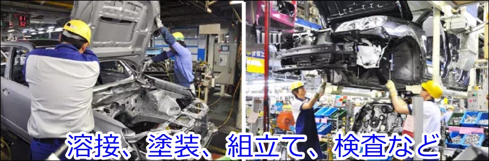 やることは車の塗装、組立て、溶接、検査などのライン作業。