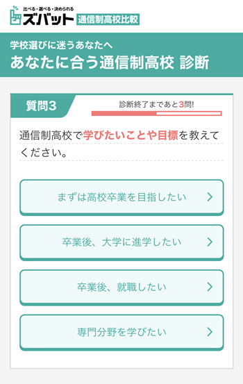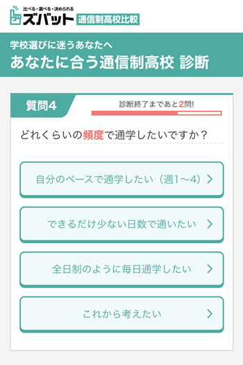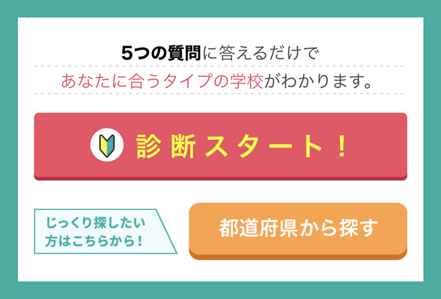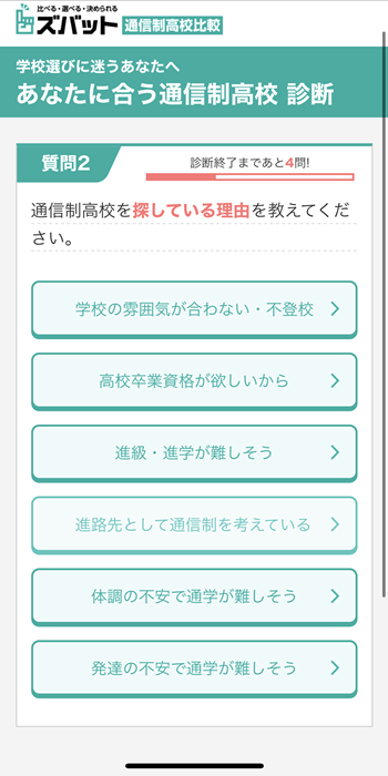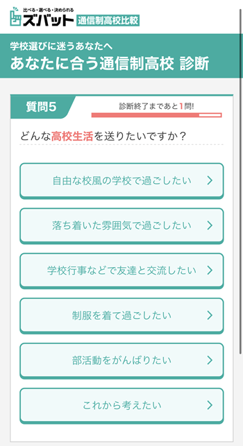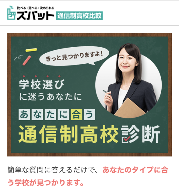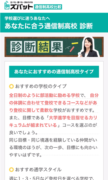 ズバット通信制高校比較はただ周辺の学校がわかるだけでなく、どういう高校ライフを送りたいかでお子さんに合ったタイプの学校を診断して選んでくれるんです!